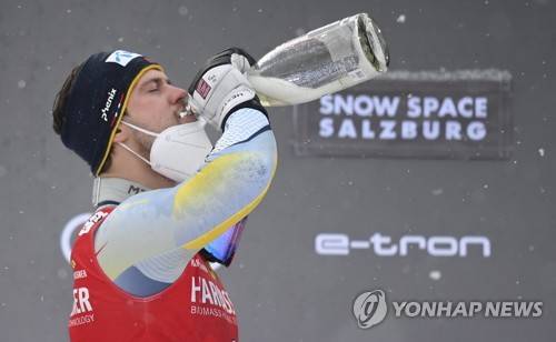 epa08943620 Sebastian Foss-Solevaag of Norway celebrates winning the Men's Slalom race at the FIS Alpine Skiing World Cup in Flachau, Austria, 17 January 2021. EPA/CHRISTIAN BRUNA