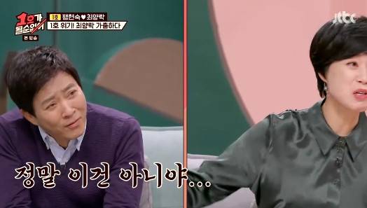이날 방송에선 팽현숙과 최양락 부부의 일상 역시 공개됐다. 최양락이 외박을 해서 울고 있는 팽현숙의 모습이 눈길을 모았다.
