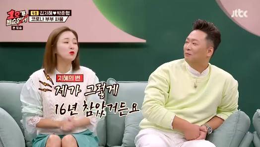 이날 김지혜와 박준형 부부의 일상이 공개된 가운데 TV를 보며 퀴즈를 맞히는 박준형의 모습이 눈길을 모았다. 이에 스튜디오에서 뇌섹남 칭찬을 듣는 박준형의 모습에 김지혜는 “고등학교때 열심히 한걸로 팽생 우려먹는다”고 말했고 최수종은 “저런 표현도 이제는 변해야 한다. 가끔은 배우자의 잘난 척도 참아줘야 할 때도 있다”고 밝혔다. 이에 김지혜는 “제가 그렇게 16년을 참았다. 이렇게 자제시키지 않으면 (자존감이) 하늘로 날아갈까봐 그런 것”이라고 하소연했다.
