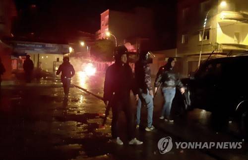 Police officers face demonstrators during clashes in Siliana, Tunisia, Saturday, Jan.16, 2021. Police used tear gas to disperse violent protests led by disgruntled youths in several Tunisian cities Saturday night to Sunday, including in the capital Tunis and the seaside city of Sousse. Though the causes are unclear, Tunisians are angry that the North African country is on the verge of bankruptcy and has dire public services. (AP Photo/Hedi Sfar) PHOTO TAKEN SATURDAY JAN 16 2021
