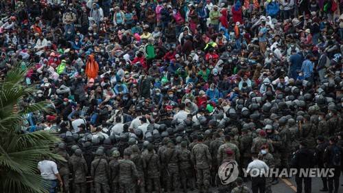 epa08943640 Several Guatemalan soldiers block Honduran migrants at a police control in the city of Chiquimula, Guatemala, 17 January 2021. Some 9,000 Honduran migrants are crossing western Guatemala on their journey to USA. EPA/Esteban Biba
