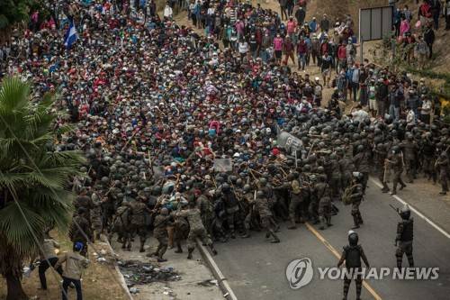 epa08943643 Several Guatemalan soldiers clash with Honduran migrants at a police control in the city of Chiquimula, Guatemala, 17 January 2021. Some 9,000 Honduran migrants are crossing western Guatemala on their journey to USA. EPA/Esteban Biba