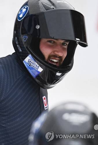 epa08943663 Benjamin Maier of Austria reacts during the Men's four-man race at the Bobsleigh World Cup in St. Moritz, Switzerland, 17 January 2021. EPA/GIAN EHRENZELLER