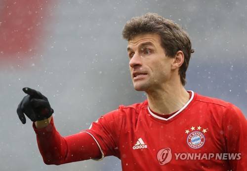 epa08943670 Thomas Mueller of FC Bayern Muenchen gives instructions during the Bundesliga match between FC Bayern Muenchen and Sport-Club Freiburg at Allianz Arena in Munich, Germany, 17 January 2021. EPA/ALEXANDER HASSENSTEIN / POOL DFL regulations prohibit any use of photographs as image sequences and/or quasi-video.