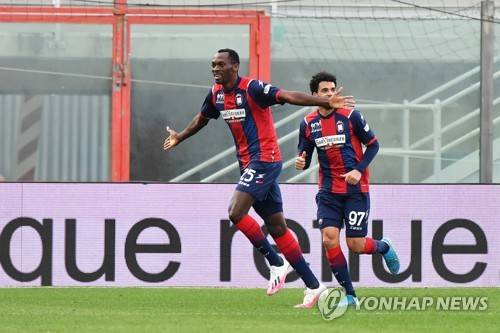 epa08943704 Crotone's Simy (L) jubilates after scoring the 2-0 goal during the Italian Serie A soccer match between FC Crotone and Benevento Calcio at Ezio Scida stadium in Crotone, Italy, 17 January 2021. EPA/CARMELO IMBESI