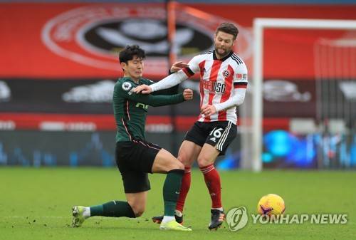 epa08943708 Oliver Norwood (R) of Sheffield in action against Son Heung-Min (L) of Tottenham during the English Premier League soccer match between Sheffield United and Tottenham Hotspur in Sheffield, Britain, 17 January 2021. EPA/Mike Egerton / POOL EDITORIAL USE ONLY. No use with unauthorized audio, video, data, fixture lists, club/league logos or 'live' services. Online in-match use limited to 120 images, no video emulation. No use in betting, games or single club/league/player publications.