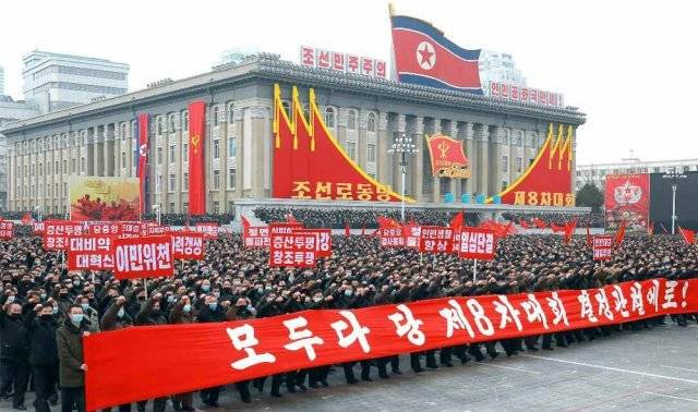 15일 평양 김일성광장에서 열린 평양시군민연합대회에 참가한 주민들이 구호를 외치고 있다. 북한 노동신문은 17일 이 소식을 전하면서 “8차 당 대회 결정을 관철하기 위한 대회”라고 전했다.