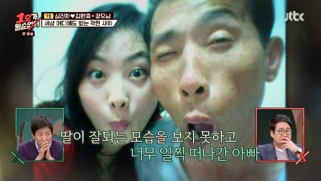 심진화는 "그거 봤을 때 지금 이렇게 돈을 벌게 할 거면 좀 나눠서, 지금 많이 안 줘도 되니 그때 조금만 주지. 결혼하고 잘 되니까 아빠가 내가 잘 된 것 봤으면 얼마나 좋겠나 (라는 생각이 든다). 그게 너무 화가 난다"고 밝혔다. 심진화의 아버지가 돌아가신 나이는 불과 쉰셋이었다. (사진=JTBC '1호가 될 순 없어' 캡처)