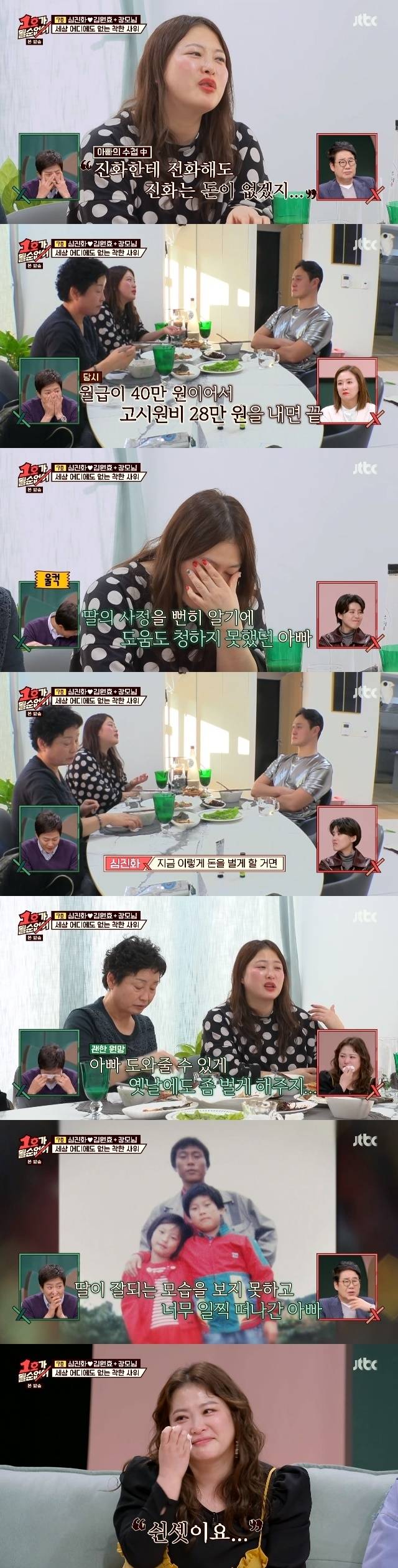 이어 심진화는 "아빠가 이걸 보면 무척 기뻐할 것"이라면서도 "그래서 나는 가끔 엄마가 밉깔(?)스럽다"고 고백했다. 심진화는 "아빠는 제일 힘들 때 돌아가셨잖나. 아빠는 먹는 것도 된장만 먹고 갔다"며 좋은 것 마음껏 누리지 못하는 삶을 사셨던 아버지에 대한 애틋한 마음을 드러냈다.