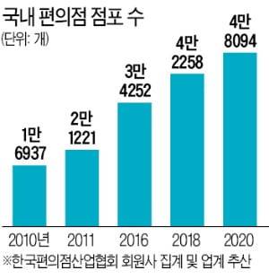 전국 편의점 점포 수는 2010년대 이후 가파르게 급증하면서 업계 안팎에서는 꾸준하게 포화 논란이 제기됐다. 2007년 처음 1만 개를 넘어선 뒤 2016년 3만 개, 2018년 4만 개를 돌파할 때도 비슷한 상황은 반복됐다. 지난해 국내 편의점 점포 수는 인구 1077명당 1개 수준. ‘편의점 왕국’으로 불리는 일본(2280명당 1개)보다 인구당 점포 밀도가 높지만 점포 평균 면적은 절반 수준이어서 대형화 쪽으로 아직 확장 여지가 많다는 게 업계의 인식이다.