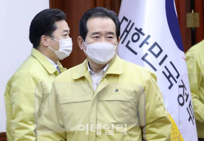 [이데일리 이영훈 기자] 정세균 국무총리가 18일 오전 서울 종로구 정부서울청사에서 열린 코로나19 대응 중앙재난안전대책본부 회의에 참석하고 있다.