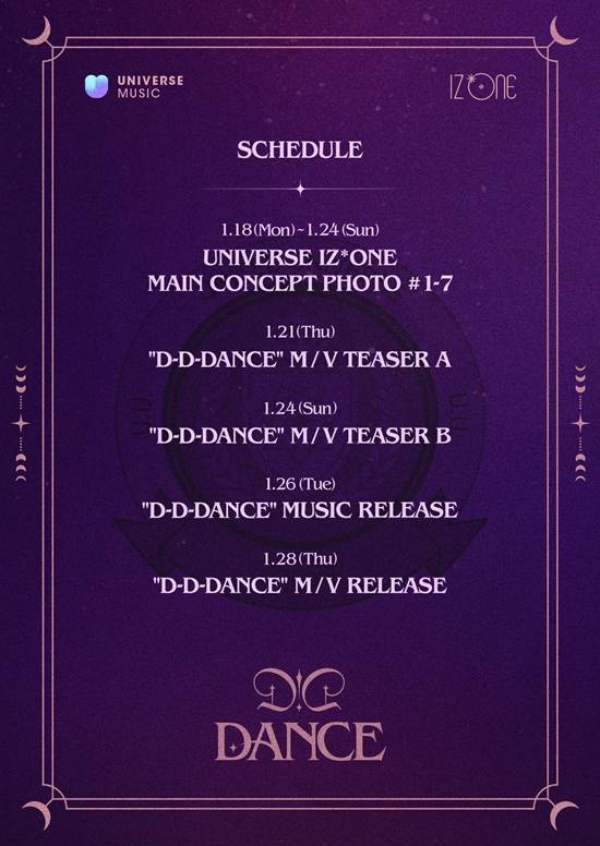 공개된 스케줄러에 따르면 IZ*ONE(아이즈원)은 오는 26일 ‘D-D-DANCE'의 발매를 앞두고 18일 오후 6시 커버와 콘셉트 포토 오픈을 시작으로, 19일 유닛 콘셉트 포토, 21일 과 24일에는 뮤직비디오 티저 등을 순차적으로 공개한다.