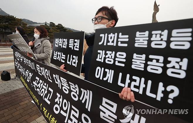 (서울=연합뉴스) 한종찬 기자 = 교육바로세우기운동본부, 정시확대추진학부모모임 등 시민단체 관계자들이 18일 오전 서울 청와대 분수대 앞에서 기자회견을 하고 있다. 이날 이들은 조국 딸 의사 국시 합격 관련해 그 과정과 결과가 부당하다고 주장했다. 2021.1.18
