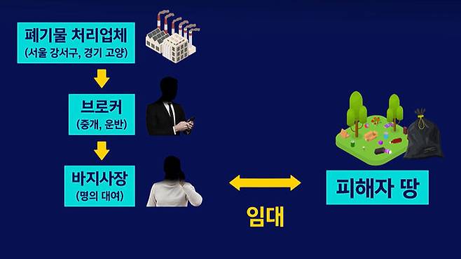 이들 일당은 폐기물 처리업체로부터 폐기물을 넘겨받습니다. 그리고 폐기물을 다른 곳으로 옮길 운반책을 모집합니다. 이와 동시에 폐기물을 투기할 장소를 물색합니다. 주로 인적이 드문 농어촌 마을의 땅을 노립니다. 그리고 명의만을 빌려줄 바지사장을 영입합니다. 바지사장은 땅 주인에게 접근해 임대 계약을 맺습니다.