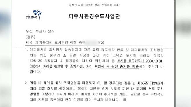 김 씨 가족은 파주시로부터 연락을 받았습니다. 폐기물 전량을 치우라고 통보를 받았습니다. 김 씨 가족은 즉각 반발했습니다. 버린 사람 따로 있기 때문입니다. 만약 김 씨 가족이 다 치우려면 최소 30억 원이 필요합니다.
