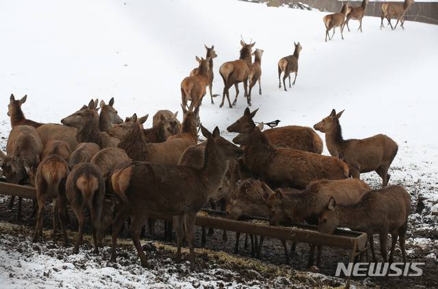 [제주=뉴시스]우장호 기자 = 대한(大寒) 절기를 이틀 앞둔 18일 오전 제주 한라산 중산간 지대의 한 농장에서 사육 중인 붉은사슴 무리가 아침 식사를 하고 있다. 2021.01.18. woo1223@newsis.com