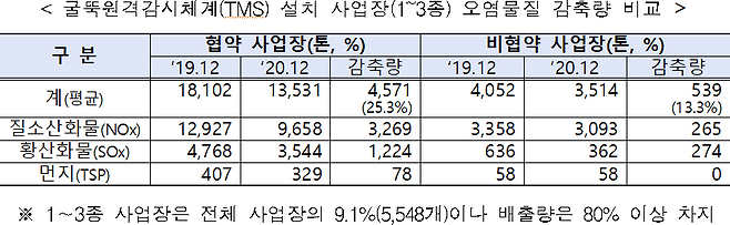 이번 감축률은 협약에 참여하지 않은 458개 굴뚝원격감시체계 설치 사업장의 같은 기간 오염물질 저감률(13.3%)과 비교시 2배 가까이 높은 수준으로 나타났다.