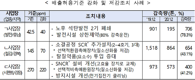특히, 석탄발전, 제철, 시멘트 등에 속한 3개 사업장은 강화된 배출허용기준의 적용, 획기적인 미세먼지 저감조치의 시행으로 주요 대기오염물질*에 대해 높은 감축률을 달성했다.