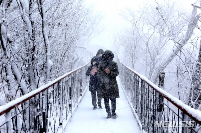 [평창=뉴시스] 김경목 기자 = 관광객들이 18일 오후 대설주의보가 발효 중인 강원도 평창 발왕산에서 펑펑 내리는 눈을 맞으며 겨울의 아름다운 경치를 즐기고 있다. 2021.01.18. photo31@newsis.com