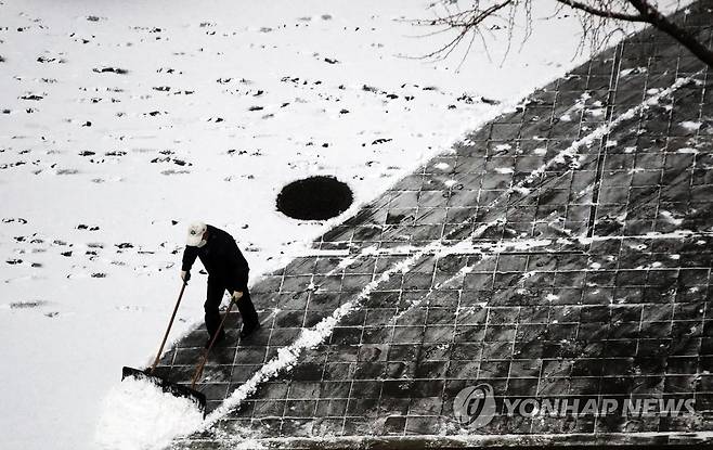 (서울=연합뉴스) 박동주 기자 = 18일 오전 서울 강남구의 한 빌딩 앞에서 관계자가 쌓인 눈을 치우고 있다. 2021.1.18