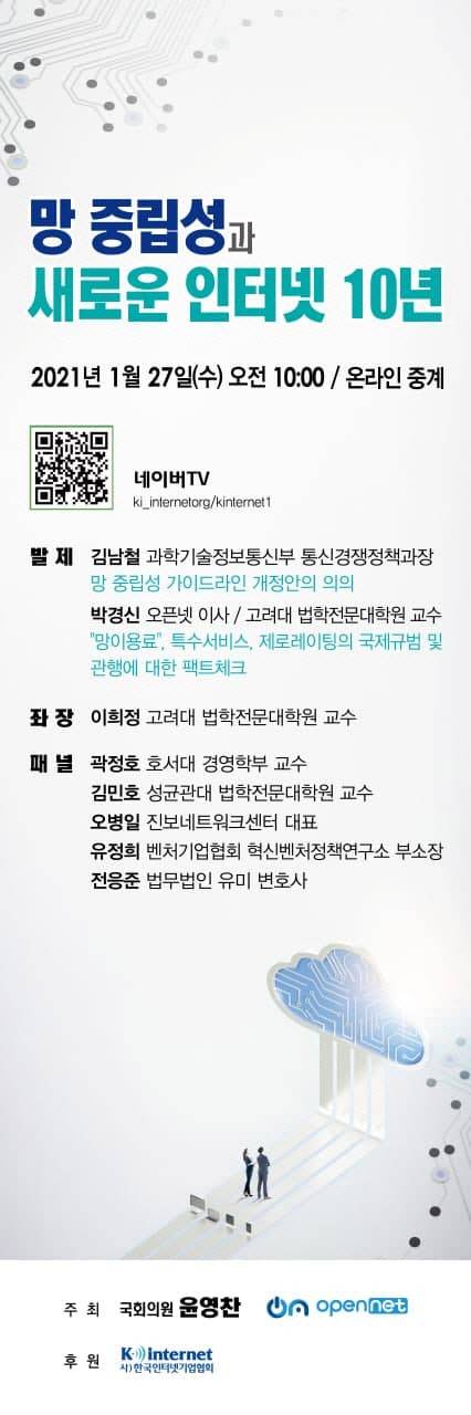 사단법인 오픈넷이 더불어민주당 윤영찬 의원실과 공동으로 1월 27일 수요일 오전 10시, "망중립성과 새로운 인터넷 10년"을 주제로 토론회를 개최한다.