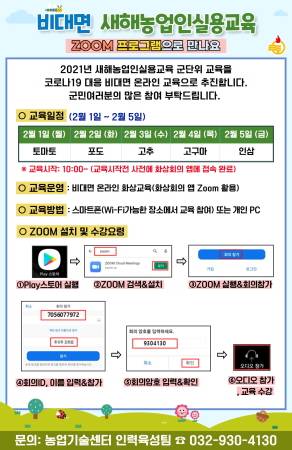 품목별 교육 일정은 ▲토마토(2월 1일) ▲포도(2월 2일) ▲고추(2월 3일) ▲고구마(2월 4일) ▲인삼(2월 5일)으로 교육을 희망하는 농업인은 비대면 화상회의(ZOOM) 앱을 활용해 스마트폰 또는 개인 PC를 통해 수강할 수 있다.