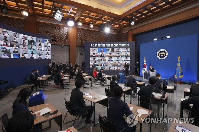 (서울=연합뉴스) 최재구 기자 = 문재인 대통령이 18일 청와대 춘추관에서 열린 신년 기자회견에서 기자의 질문에 답하고 있다. 2021.1.18