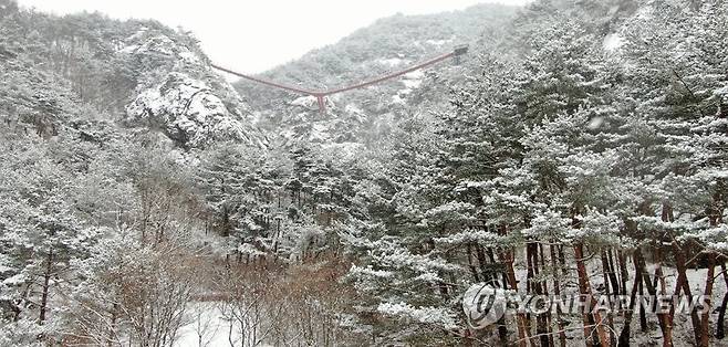 (서울=연합뉴스) 18일 대설주의보가 발효된 경남 거창군 가조면 우두산 Y자형 출렁다리에 많은 눈이 내리고 있다. 2021.1.18