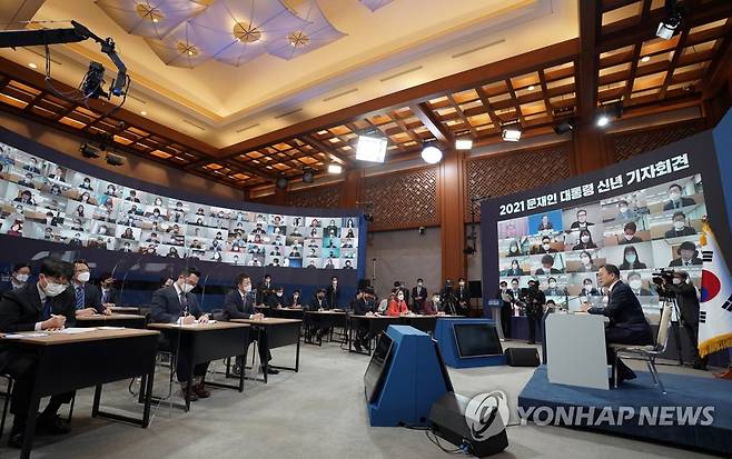 (서울=연합뉴스) 최재구 기자 = 문재인 대통령이 18일 청와대 춘추관에서 열린 신년 기자회견에서 기자의 질문에 답하고 있다. 2021.1.18