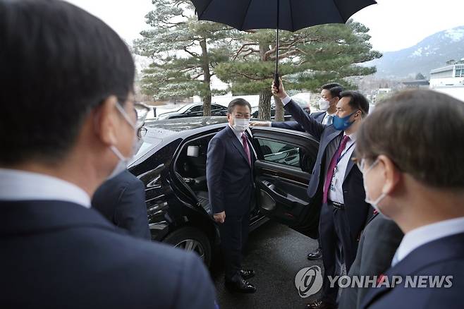 (서울=연합뉴스) 최재구 기자 = 문재인 대통령이 18일 청와대 춘추관에서 신년 기자회견을 마치고 춘추관을 나서며 유영민 비서실장, 서훈 국가안보실장, 김상조 정책실장 등의 배웅을 받고 있다. 2021.1.18