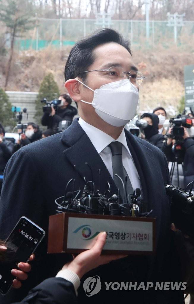 (서울=연합뉴스) 김도훈 기자 = 이재용 삼성전자 부회장이 18일 오후 서울 서초구 서울고등법원에서 열린 국정농단 사건 파기환송심 선고 공판에 출석하며 기자들의 질문에 답을 하지 않고 있다. 2021.1.18