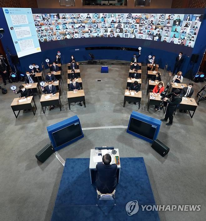 (서울=연합뉴스) 최재구 기자 = 문재인 대통령이 18일 청와대 춘추관에서 열린 신년 기자회견에서 기자의 질문에 답하고 있다. 2021.1.18
