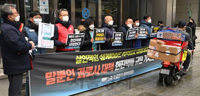[서울경제] 18일 오후 서울 중구 한진택배 본사 앞에서 택배노동자 과로사 대책위원회 주최로 과로사 대책 미이행 규탄 기자회견이 진행되던 중 한 택배 기사가 그 앞을 지나고 있다./오승현기자 2021.01.18