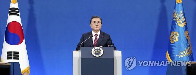 (서울=연합뉴스) 최재구 기자 = 문재인 대통령이 18일 청와대 춘추관에서 열린 신년 기자회견에 참석해 있다. 2021.1.18