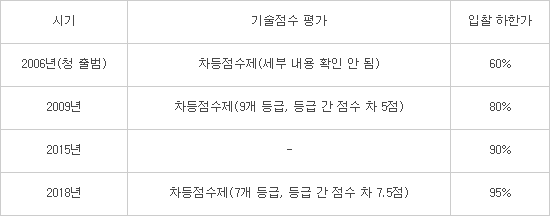 예를 들어 1위는 100점, 2위는 95점 등으로 차등 폭을 둬 변별력을 높이는 게 목적이다. 기술평가 점수 차이가 소수점 두셋째 자리에 불과하기 때문에 순위를 뒤집기 위해 가격을 후려치는 부작용을 없앨 수 있다.