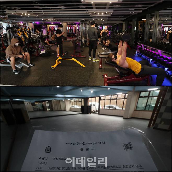 실내체육시설의 집합금지 조치가 해제됐지만 격렬한 운동의 경우 여전히 집합금지가 적용된 18일 서울 한 헬스장에서 시민들이 운동(윗 사진)하고 있는 반면 에어로빅 체육관에 집합금지 안내문이 붙어있다.