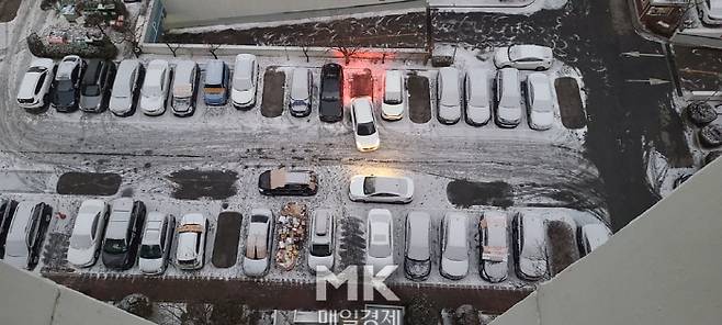 눈이 내린 18일 오전 경기도 안양시 동안구의 한 아파트 단지 주차장의 차량에 눈이 쌓여있다.