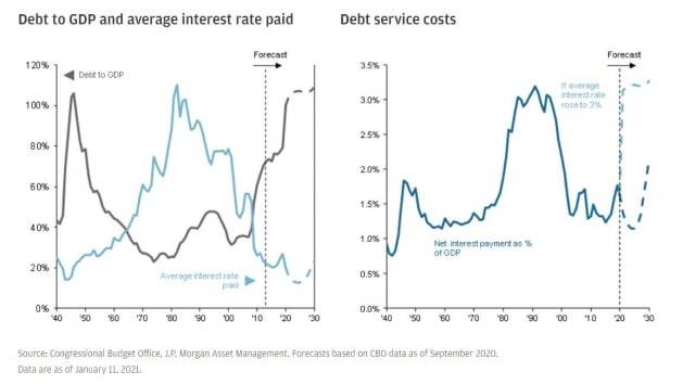 JP모간은 연방정부 부채 수준이 GDP의 100.1 %에 달해 제2차 세계 대전 이후 가장 높아졌지만, 부채 증가의 한계는 절대 부채 수준이나 GDP 대비 부채비율이 아니라 부채 상환 비용을 봐야한다고 분석했다.