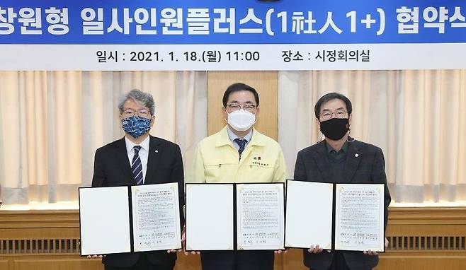 (서울=연합뉴스) 경남 창원시, 한국산업단지공단 경남지역본부, 창원국가산업단지 경영자협의회가 18일 창원시청에서 '1개 회사마다 청년을 1명 더 채용하겠다'는 내용을 골자로 하는 민관합동 일자리 창출 협약을 했다.