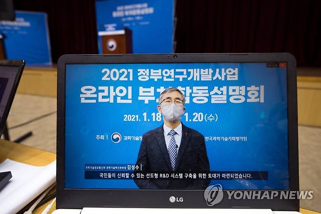 (서울=연합뉴스) 김성수 과학기술정보통신부 과학기술혁신본부장이 18일 오후 세종특별자치시 정부세종컨벤션센터에서 열린 '2021 정부연구개발사업 온라인 부처합동설명회'에서 영상을 통해 축사하고 있다. 2021.1.18