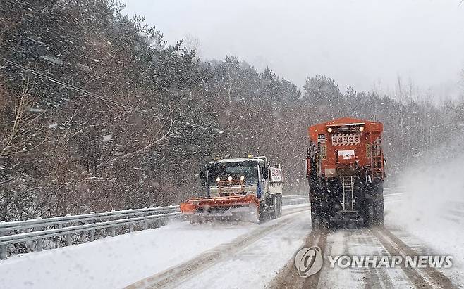 (양양=연합뉴스) 양지웅 기자 = 강원 내륙과 산지를 중심으로 대설주의보가 발효 중인 18일 오후 강원 양양군 구룡령 옛길에서 제설 차량이 도로 위의 눈을 치우고 있다.