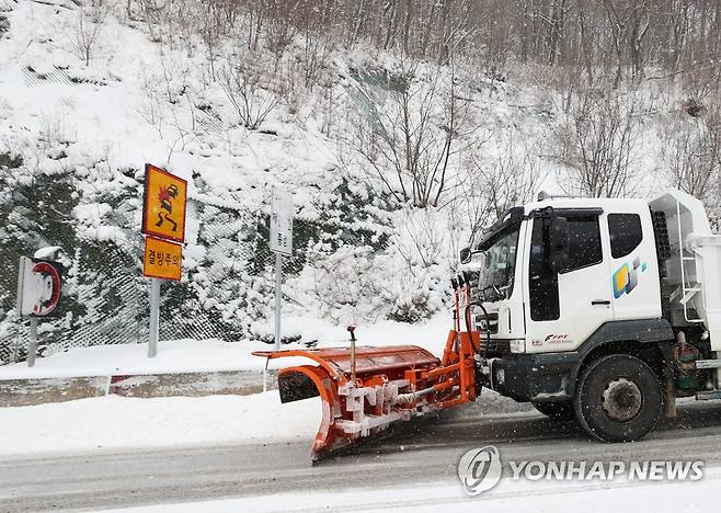 (양양=연합뉴스) 양지웅 기자 = 강원 내륙과 산지를 중심으로 대설주의보가 발효 중인 18일 오후 강원 양양군 구룡령 옛길에서 제설 차량이 도로 위의 눈을 치우고 있다.