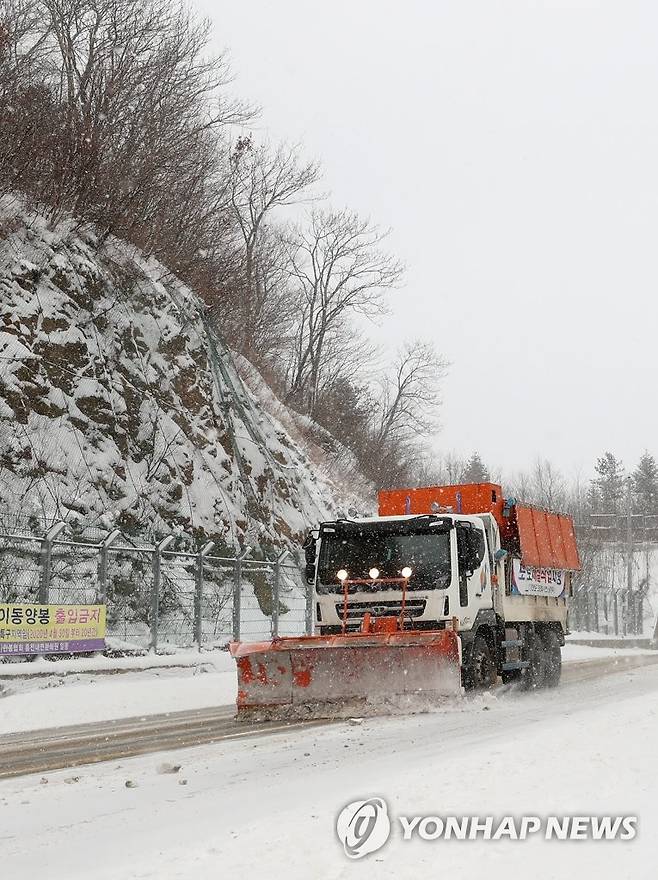 (양양=연합뉴스) 양지웅 기자 = 강원 내륙과 산지를 중심으로 대설주의보가 발효 중인 18일 오후 강원 양양군 구룡령 옛길에서 제설 차량이 도로 위의 눈을 치우고 있다.