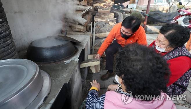 (김해=연합뉴스) 김동민 기자 = 경남 김해지역 최저 기온이 영하 11도를 기록한 18일 김해시 상대면 대감리 한 가정에서 시민이 아궁이에 장작을 넣고 있다. 2021.1.18