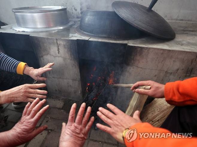 (김해=연합뉴스) 김동민 기자 = 경남 김해지역 최저 기온이 영하 11도를 기록한 18일 김해시 상대면 대감리 한 가정에서 시민이 아궁이에 장작불을 태우고 있다. 2021.1.18