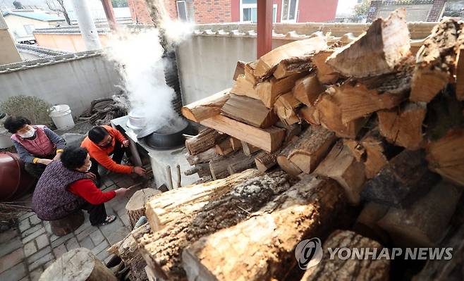 (김해=연합뉴스) 김동민 기자 = 경남 김해지역 최저 기온이 영하 11도를 기록한 18일 김해시 상대면 대감리 한 가정에서 시민이 아궁이에 장작불을 태우고 있다. 2021.1.18
