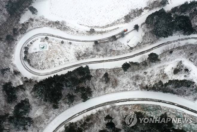 (양양=연합뉴스) 양지웅 기자 = 강원 내륙과 산지를 중심으로 대설주의보가 발효 중인 18일 오후 강원 양양군 구룡령 옛길에서 제설 차량이 도로 위의 눈을 치우고 있다.