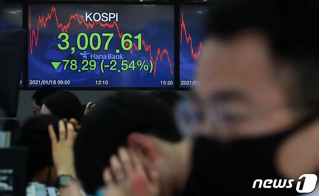 (서울=뉴스1) 구윤성 기자 = 18일 오후 서울 중구 하나은행 명동점 딜링룸 전광판에 코스피 지수가 3,007.61을 나타내고 있다. 코스피는 이날 전 거래일 대비 71.97포인트(2.33%) 하락한 3013.93으로 장을 마감했다. 이날 코스닥도 19.77(2.05%) 내린 944.67에, 원달러환율은 4.5원 오른 1,103.9원으로 장을 마쳤다. 2021.1.18/뉴스1