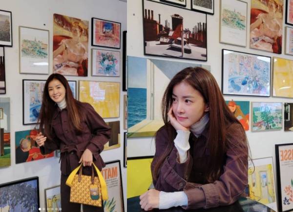 공개된 사진 속 이시영은 잠시 외출에 나선 모습으로, 화려한 작품들로 꽉 채워진 벽을 배경으로 다양한 자세를 취하고 있다.