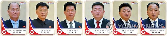 박정근(왼쪽부터)·전현철·김성룡·리성학·박훈·주철규 등 6명이 부총리 명단에 새로 이름을 올렸고 박정근과 주철규는 국가계획위원장과 농업상을 각각 겸직했다. 2021.1.18